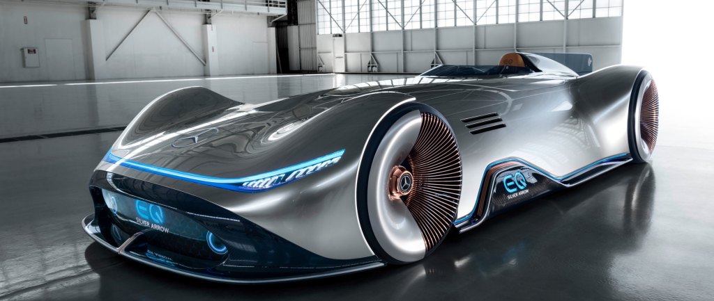 Mercedes’ EQ Silver Arrow is a homage to the record-breaking W125 Silver Arrow back in 1937, the paintwork in alubeam silver pays respect to the original Silver Arrows which a fun fact was due to weight reasons why they were not painted with a white paint layer. The entire design of the car embodies elements of both the past and the future, with a unique futuristic exterior look which follows through into the interior; a curved panoramic screen that displays a £d image of the surroundings and it even allows you to take part in virtual races with other Silver Arrows both from the past and the present. The EQ Silver Arrow takes on the route of technological advancements and the future for electric vehicle technology.
